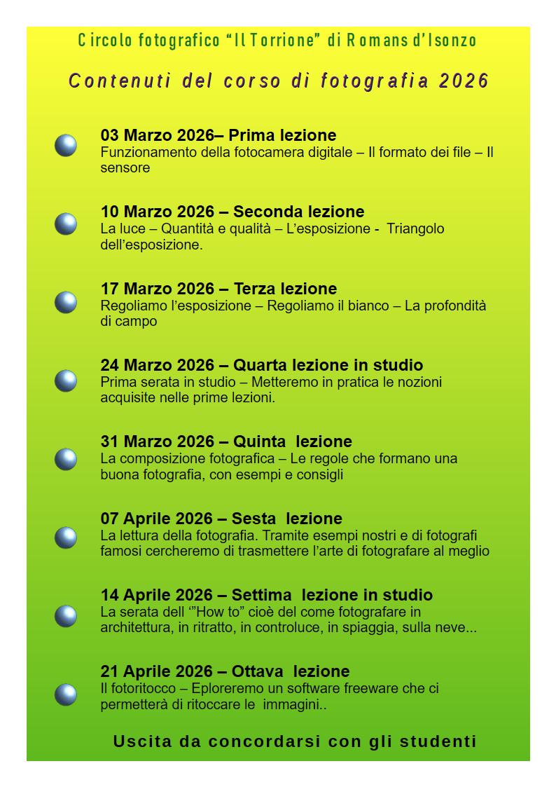 | Per iscriversi al corso di fotografia 2026 è necessario compilare il modulo che si trova cliccando -> QUI |